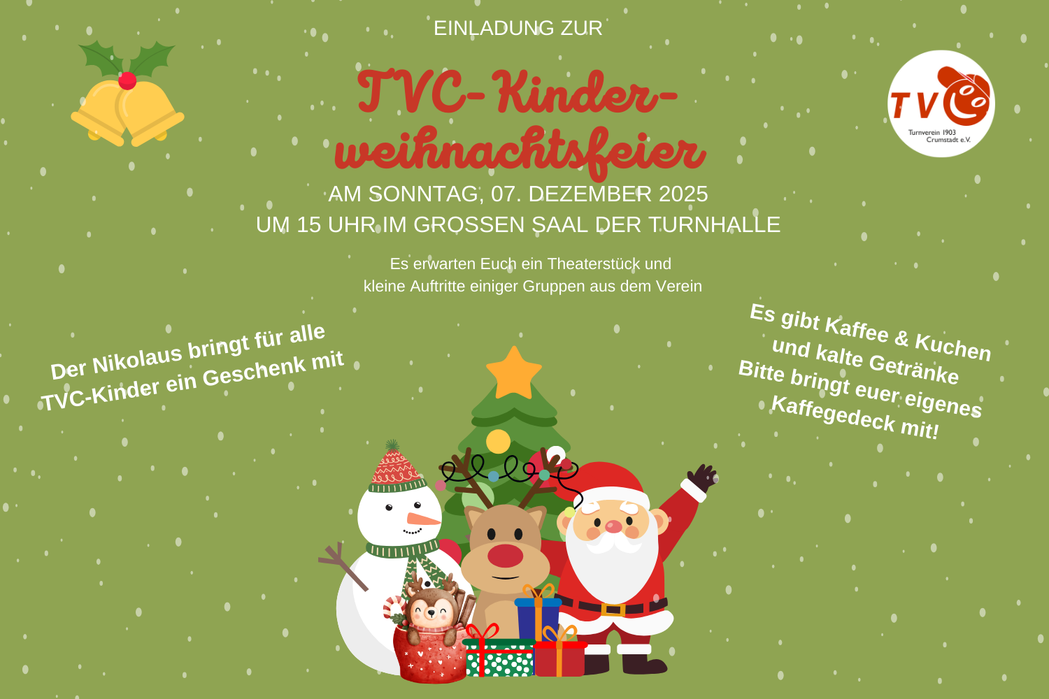Die TVC-Kinderweihnachtsfeier findet am Sonntag, 7. Dezember, ab 15 Uhr im großen Saal der Turnhalle statt.Ihr seid herzlich eingeladen !