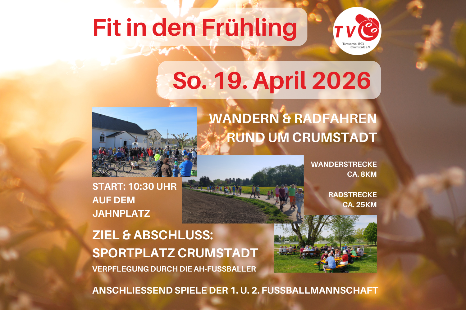 Am Sonntag, 19. April 2026, Wandern und Radfahren mit dem TVC rund um Crumstadt. Start 10:30 Uhr auf dem Jahnplatz. Abschluss auf dem Sportplatz mit Gegrilltem, Kaffee und Kuchen und kühlen Getränken. Anschließend Fußballspiele der 1. und 2. Mannschaft.