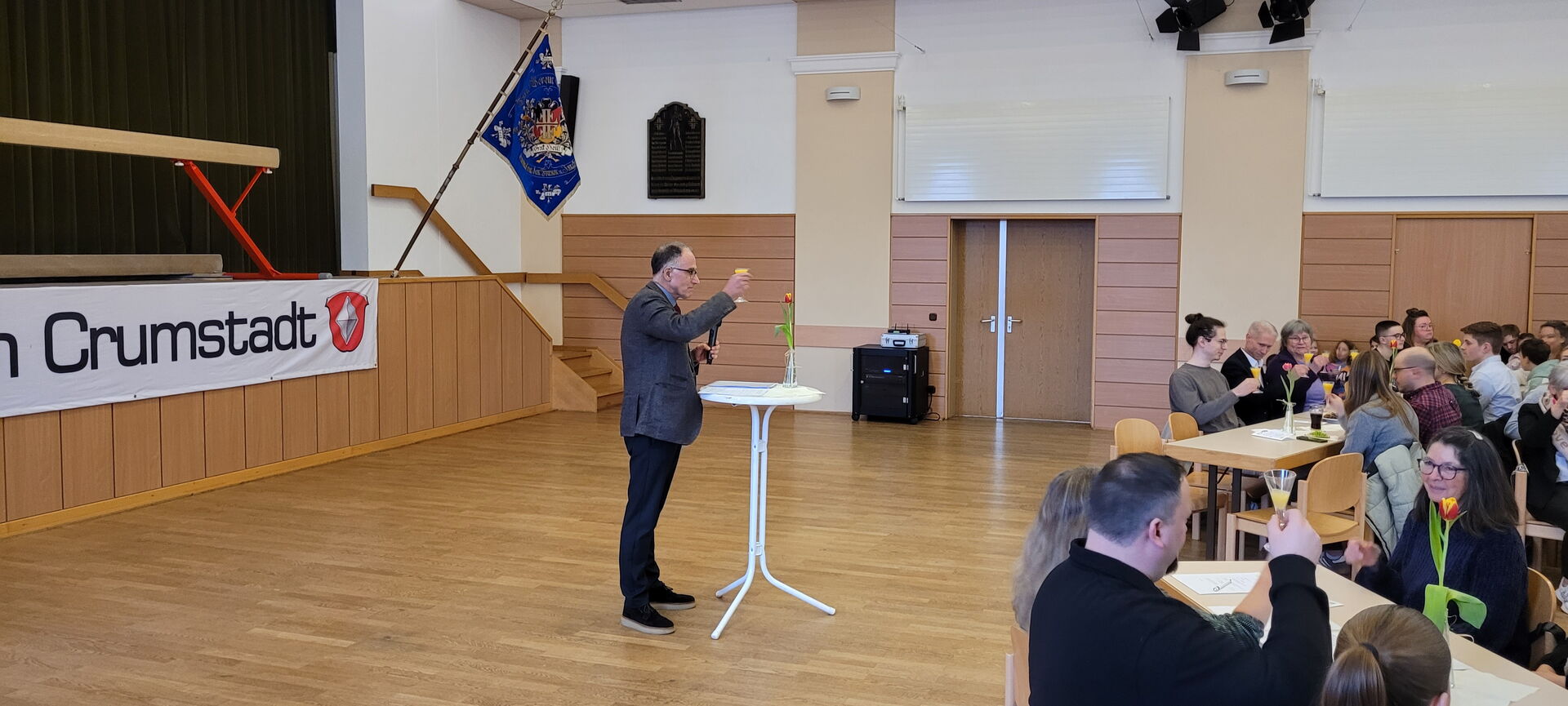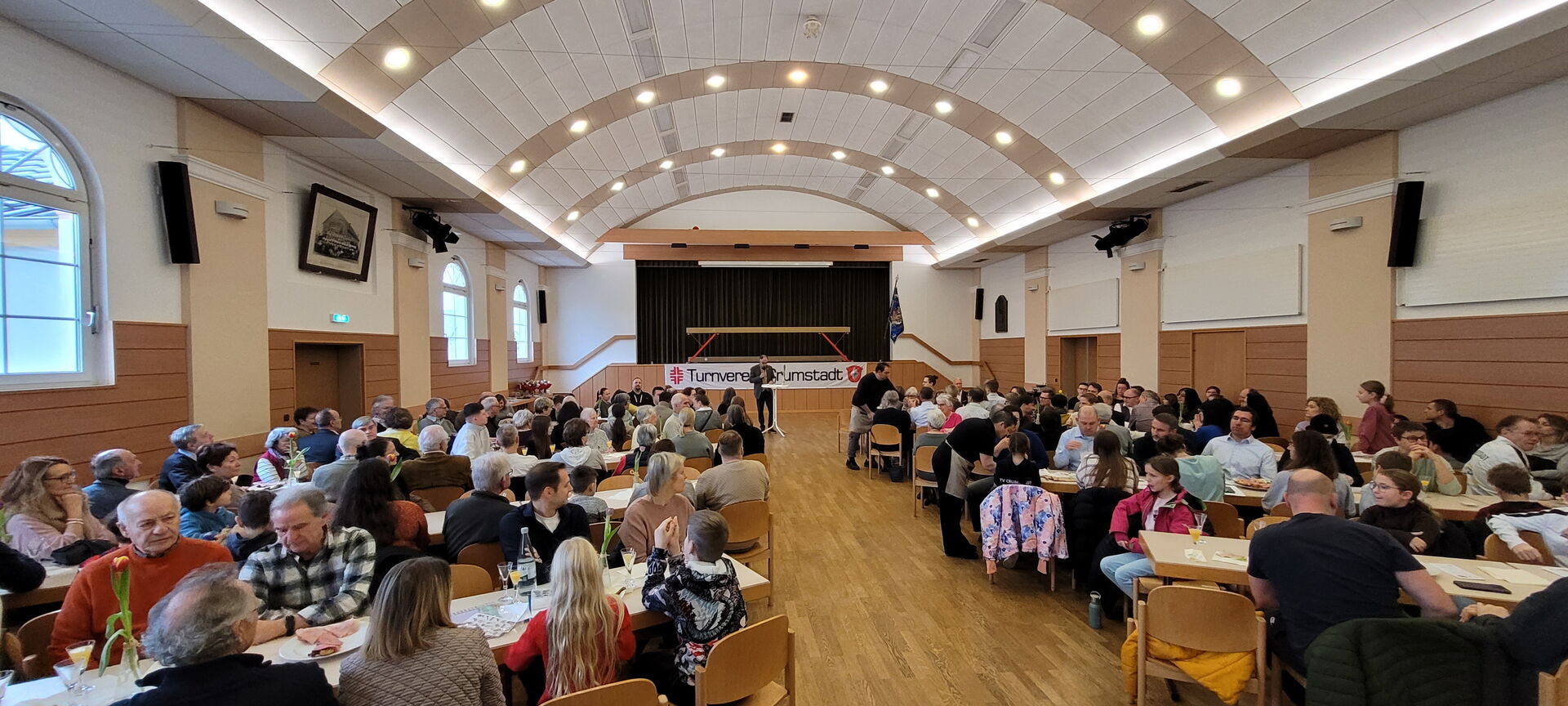 Am Sonntag, dem 18.01.2026, lud der TV Crumstadt zu seinem Neujahrsempfang in die Turnhalle ein. Um 11 Uhr begrüßte der erste Vorsitzende, Gernot Hofmann, mehr als 200 Gäste im großen Saal. In seiner Neujahrsansprache blickte er auf ein erfolgreiches Jahr zurück, trotz weltweiter Krisen und wirtschaftlicher Herausforderungen. Die Mitgliederzahl ist zum 01.01.2026 auf 1.733 gestiegen, was auf die guten Sportstätten und das Engagement vieler Trainer und Helfer zurückgeführt wird. Das ist ein Zuwachs von 110 Mitgliedern im Vergleich zum Vorjahr. Neue Angebote wie Muay Thai und Mädchenfußball wurden etabliert, bestehende Sparten wie Rope Skipping und Gerätturnen verzeichnen großen Zulauf, sodass teilweise Aufnahmestopps nötig waren. Die Sportstätten sind nahezu ausgelastet. Die neue Trainingshalle für Gerätturnen wird auch von externen Vereinen und Verbänden genutzt. Ein besonderer Dank gilt allen Engagierten im Verein, verbunden mit dem Aufruf, sich weiterhin einzubringen. Für 2026 stehen neue Herausforderungen an, insbesondere durch den gesetzlichen Anspruch auf Ganztagsbetreuung an Schulen, was Auswirkungen auf die Nutzung der Sporthallen haben wird. Hierzu sind Gespräche mit der Schulleitung geplant. Zudem soll die Satzung zum Thema „Kindeswohl im Verein“ angepasst werden und im Jugendfußball wird über die Gründung eines Fördervereins nachgedacht. Die Ansprache endet mit einem positiven Ausblick und dem Ziel, den Verein weiterhin zum Wohle aller Mitglieder und besonders der Jugend zu führen.