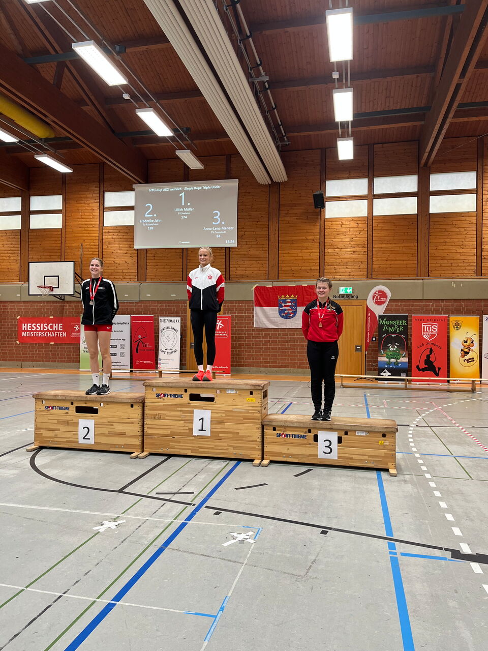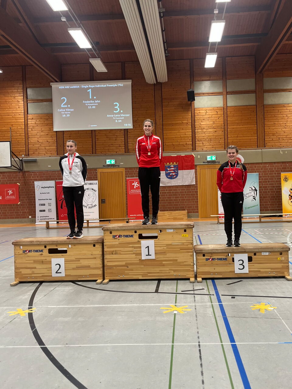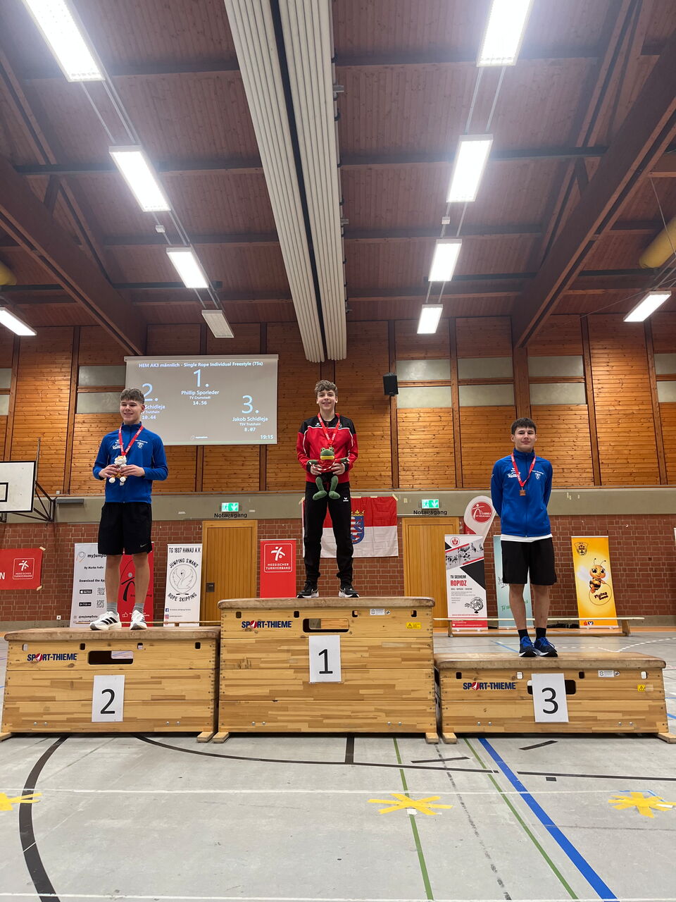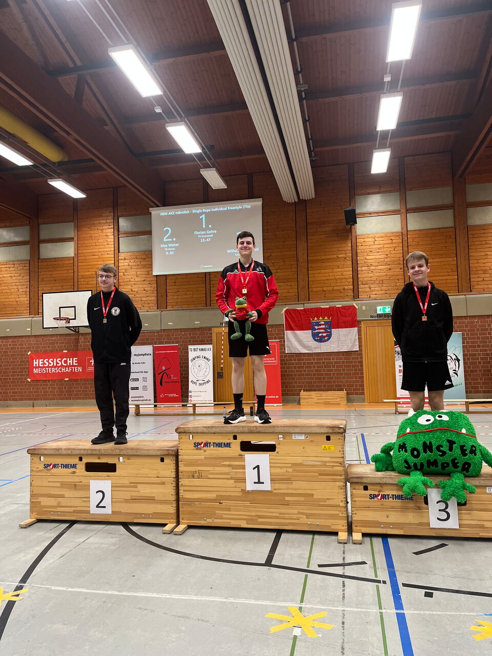 Am 08.11.2025 fanden die Hessischen Einzelmeisterschaften in Melsungen statt. Um 6 Uhr morgens hieß es Abfahrt. Mit Alina Opelt, Anna-Lena Menzer, Phillip Sporleder, Florian Gehre und Robin Krauß ging es mit 5 Springerinnen und Springern an den Start. Sie starteten in den Disziplinen Single Rope Speed Sprint, Single Rope Speed Endurance, Single Rope Individual Freestyle sowie im Double Under- sowie Triple Under-Cup. Schnell zeigte sich, dass die Frösche sehr starke Leistungen an den Tag legten und bewiesen ihr monatelanges Training. Es wurden gesetzte Ziele erreicht oder sogar übertroffen. Auch bei den Freestyles konnten alle eine saubere Leistung präsentieren und ihre Routinen mit keinem bis wenigen Hängern präsentieren.
