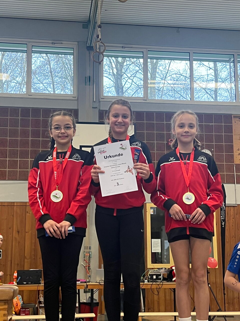In der AK 15-17 starteten Marie Bahl, Leni Knecht sowie Lilly Lehmann als Team. Auch sie konnten alle Disziplinen fast fehlerfrei präsentieren und zeigen, dass sich das fleißige Training vorher gelohnt hat. Sie hatten in ihrer Altersklasse zwar keine Konkurrenz, konnten sich aber von allen Teams die Tageshöchstpunktzahl erspringen.